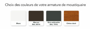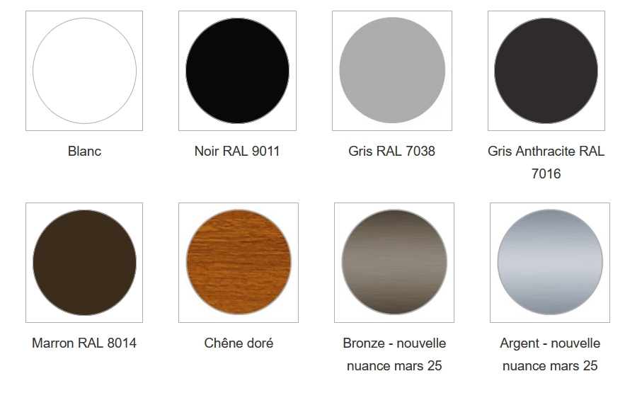 L’armature en aluminium laqué est disponible en plusieurs coloris élégants – blanc, gris anthracite, marron et chêne doré – pour s’harmoniser parfaitement avec vos menuiseries, alliant style et durabilité.
